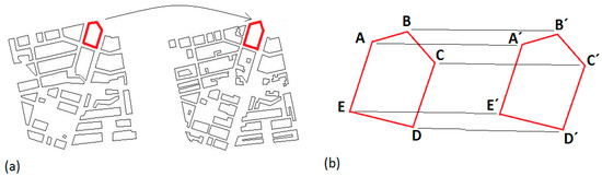After having matched the polygonal shapes (buildings) from both GDBs, and in order to achieve a vertex-to-vertex matching, a metric derived from the method defined by Arkin et al. [49] was used. Following these authors, a common representation of the boundary of a simple polygon PA can be obtained by the turning function . However, we used this function, which measures the angle of the counterclockwise tangent, as a function of the arc-length s in the clockwise direction, measured from some reference point 0 on A’s boundary. Thus, is the angle v that the tangent at the reference point 0 makes with some reference orientation associated with the polygon (such as the x-axis). keeps track of the turning that takes place, increasing with left-hand turns and decreasing with right-hand turns. If we assume that each polygon is rescaled so that the total perimeter length is one, then is a function from (0, 1) to (−4π, 4π) (Figure 5). The function has several properties, which make it especially suitable for identifying and extracting homologous points between two polygons. As mentioned in [49], it is piecewise-constant for polygons, making computations particularly easy and fast. By definition, the function is invariant under translation and scaling of the polygon A. Rotation of A corresponds to a simple shift of in the θ direction. In addition, we used the area of the region below in order to define what we denominated as an Arkin Graph Area (AGA). This area can be easily computed by the value of the integral (Equation (2)) and was used as another polygon’s shape descriptor in the classification stage. This integral can be obtained numerically by a sum of prisms because the changes in height only take place in each vertex.