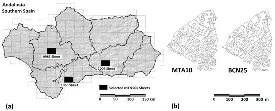 (a) Selected sheets of the Mapa Topográfico Nacional (MTN) at the scale of 1:50,000 of the region of Andalusia (southern Spain) and its administrative boundaries and (b) examples of polygonal features belonging to Mapa Topográfico de Andalucía E10K (MTA10) and Base Cartográfica Numérica E25k (BCN25) (Carmona, 0985 sheet).