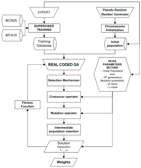 The classification methodology is based on computing a set of weights that must be assigned to the features sets and then using these weights to confront each object from both GDBs. To achieve this goal, it is necessary not only to establish the capability of the RCGA as a classification tool, but also to demonstrate that it can produce sufficiently good quality matches by means of a fitness function. The fitness function evaluates the quality of each solution (chromosome) [54]. In our approach, this function evaluates each of the weights assigned to each of the descriptors used to identify pairs of objects, the genes included in the chromosome. The weights evaluate the similarity of the polygon matching over a supervised training database, and the value obtained represents the quality of this solution. Obtaining this database using a supervised training procedure was the first stage of the process. The training database was composed of 805 polygons, with their respective homologous polygons, that were manually obtained by three different cartographers. The set of polygons obtained by these three cartographers was 265, 265 and 275 homologous polygons. These three sets were independent of each other and different from the final GDB used for the matching. However, the polygons were extracted from GDBs similar to those used in this paper. These two hypotheses, using different cartographers and a different set of GDB polygons, were used to avoid the influence of the person selecting homologous polygons and the polygons to be used. In addition, the supervised training process was externally evaluated by fifteen reviewers selected from a pool of internationally recognized experts. Their participation in the procedure reveals the robustness of the training process and the quality of the training dataset. Both the details relating to this procedure and the software implemented specifically for carrying it out can be found in [73,74].
