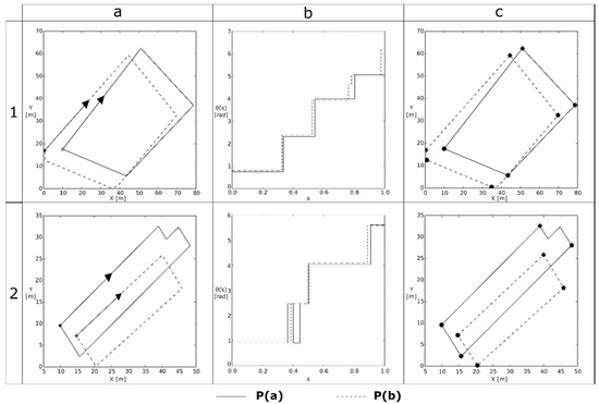 In our approach, we used the angle formed by any side of a polygon and the extension of its adjacent side (exterior angles of a polygon) to compute the turning functions. We must note that the exterior angles of a simple polygon always add up to 4π. As mentioned above, if each polygon is rescaled so that the total perimeter length is one and the exterior angles always add up to 4π, then the turning functions of two matched polygons can be overlapped and compared (Figure 6, Column b). Taking this idea in mind, we used this formulation to compute a distance function for comparing two simple polygons (PA and PB) by looking at natural notions of distances between their turning functions and . Thus, each discontinuity is defined by a pair of points, which represents a vertex of the first polygon that can be matched with another vertex of the second one (homologous vertex) (Figure 6, Column c).