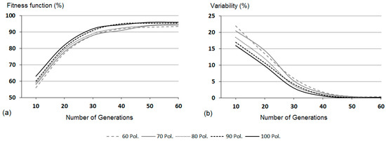 The experimental parameters that define the RCGA behavior are mainly five: the size of the initial population, number of generations, α parameter (crossover operator), β parameter and probability of mutation (mutation operators). The values assigned to the different parameters are included in Table 1. In addition, the relation between the size of the initial population and number of generations has also been highlighted in Section 3.2, so these two parameters are usually defined together using RCGA speed convergence as the criterion for their definition. In order to determine their values, an experimental test was carried out. The only objective of this test was to determine the effects that different initial populations have on the convergence (number of generations required to reach the stability of the fitness function) and the final fitness function value. To do this, a supervised database of homologous polygons is needed. The supervised database is composed of 800 pairs of polygons matched by specialized cartographers. This database was fragmented into five samples composed of 60, 70, 80, 90 and 100 pairs of polygons each, and 15 chromosomes, different possible solutions, was the initial value selected as the starting population. The experimental results show that the RCGA convergence is reached after 45 or 50 generations (Figure 7b) (when there is no change in the fitness function value (95%), Figure 7a). Therefore, 45–50 generations should be sufficient to reach an adequate solution for the mentioned size of the initial population. However, it is advisable to exceed the number of generations in order to ensure convergence results, so the final value given to the number of generations was 100. Taking all this into account, and using the ratio value (size of population/number of generations) of 1/5 suggested by Correa et al. (2009) [77], the ultimate size of the initial population was 20 chromosomes.