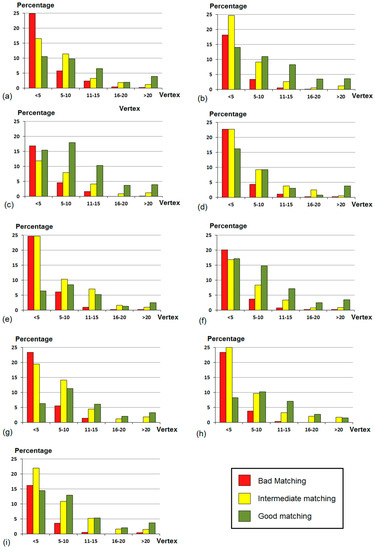 In addition, it also sets out the results of the percentage distribution of matched polygons for each interval of accuracy (MAV) grouped by number of vertexes. This is because, although AGA is a powerful shape descriptor (as shown in Table 2), its value is not very intuitive compared to the number of vertexes of a polygon. Figure 8a–i displays these data in the form of a bar chart for each urban area under analysis.