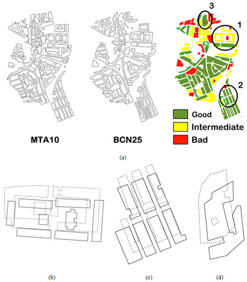 Finally, Figure 9a shows an example of the spatial distribution of polygons according to the MAV value achieved, or in other words the shape similarity measure between polygons. More specifically, it shows the spatial distribution corresponding to a part of the urban area of Alhaurín de la Torre (1066 sheet). In this figure, the matched polygons are distributed throughout the whole area, which is a good indicator that the matching algorithm is not affected by spatial position. With regards to polygons with intermediate MAV values, these represent high vertex and AGA differences between MTA10 and BCN25 (e.g., the polygons with “c” shapes with no counterpart in MTA10, marked as 1 and enlarged in Figure 9b). Finally, well-matched polygons include both polygons that can be considered equal with low differences in AGA, position and with the same number of vertexes to polygons with vertex differences and AGA. The first include small rectangular polygons on the bottom left of the image, marked as 2 and enlarged in Figure 9c. The second include polygons with more differences, e.g., the green polygon with a red one inside (marked as 3 and enlarged in Figure 9d).