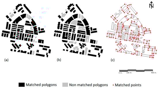 (a) Spatial distribution of matched and non-matched polygons (BCN25). (b) Spatial distribution of matched and non-matched polygons (MTA10). (c) Spatial distribution of matched point (Granada, Sheet 1009).