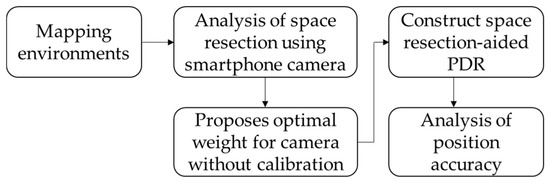 The core methods used in this research can be divided into three major parts: indoor mapping, space resection, and PDR, each described in one of the following sections. The first section explains the mapping methods used and where they are applied and includes a traditional survey for check points and mobile mapping for fast generation of geo-referenced images. The use of IMMS technology is particularly complex and is related to GNSS/INS integration and direct geo-referencing. Direct geo-referencing is a technique that can be used for photogrammetry [29]. Geo-referencing means the coordinate system of a map or image can be related to a ground coordinate system. Therefore, the ground coordinate of an interesting point in an image can be directly measured, and the spatial information can be further extracted. Therefore, the first section only provides a brief description of the mapping procedure, accuracy, and the specification of the applied system. The second section illustrates the concept and the analysis procedure of space resection. The analysis includes different scenarios to evaluate the effect of IOPs and different geometry of control points. Then, the optimal weighted least squares method of space resection for an un-calibrated smartphone camera can be determined. The third section illustrates the algorithm of the used PDR. The used algorithm is not complex because the purpose of this research is to evaluate the performance of an integrated positioning system for a smartphone user without any parameter tuning and calibration of PDR.