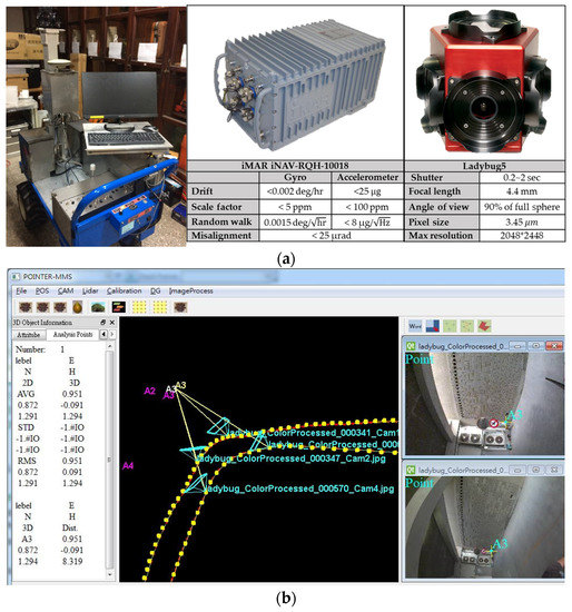 Since a traditional survey for geo-referenced images can be very time-consuming, depending on the total number of control points, IMMS has been developed to collect the environmental images quickly and then the arbitrary number of control points, which can be easily measured. This procedure is performed using a kind of photogrammetric technology called direct geo-referencing. Direct geo-referencing requires accurate camera position and attitude. To accomplish this, the self-developed software was used to precisely estimate the trajectory of IMMS based upon the Extend Kalman Filter (EKF), constraint algorithms of Non-Holonomic Constraint (NHC) and Zero Velocity Update (ZUPT), and Rauch-Tung-Striebel (RTS) smoother. Because there are three different KFs used in this research, the EKF used for IMMS is called MEKF for distinction in this research. Meanwhile, even the matrix operations of the prediction and update stage are the same; the related matrixes are still different, such as their state vector matrixes. In the mapping procedure, a large GNSS-denied environment is a harsh space for an INS/GNSS integration system, even using MEKF, smoothing, NHC and ZUPT. Therefore, according to the specification of the used INS, velocity of vehicle and past experience, some control points are surveyed by the total station every 200 m. Those control points are measured in an image for space resection, then the position and attitude of IMMS can be estimated to update the MEKF solution at that epoch. The IMMS was initialized outdoors, and moved two small circles to make the MEKF stable before entering the experimental indoor field. In the indoor environment, the trajectory of IMMS can be accurately estimated for geo-referencing. Information regarding the software can be found in our previous research [31]. With respect to the system components, the IMMS developed by National Cheng Kung University (NCKU) is an INS/GNSS integration system, which consists of GNSS, navigation-grade Inertial Measurement Unit (IMU), a 360-degree spherical camera system, a power supply and an industrial computer, as shown in Figure 2a. Similar systems can be found in [32,33,34]. The second self-developed software is used to produce the geo-referenced images with TWD97 coordinates, as shown in Figure 2b. The accuracy of the produced geo-referenced images is 1.03 m (Root Mean Square Error, RMSE) in the test field based on 39 check points.