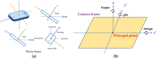 Space resection estimates the EOPs of a smartphone camera as the user’s location. Each object point with a known ground coordinate serves as a control point, enabling the construction of two equations based on collinearity equations. Therefore, at least three control points are needed to solve the unknown EOPs (six parameters). Meanwhile, more control points are needed as the redundant measurement for better estimation by least squares. However, the relation between observations and unknowns is nonlinear, so it is necessary for the equations to be linearized using the Taylor theorem. The collinearity equations can then be used to derive partial derivatives with respect to the unknown EOPs, where the exact form can be found [29]. Therefore, the initial values of unknown EOPs are needed for iterative calculations due to the use of linearized equations. The initial values of EOPs in terms of attitude and position are given by the orientation sensor and the PDR algorithm, respectively, in our indoor research. A special case is the first location at the beginning of navigation, which cannot be provided by PDR because of its characteristic relative positioning. Therefore, the initial outdoor location provided by GNSS is needed. The initial values of position are in the ground coordinate system for space resection. However, the attitude from the orientation sensor is in a phone frame, as shown on the left of Figure 3. When the user takes the image, the attitude given by the orientation sensor is relative to the local level frame (North, East, down). In addition, the initial values of rotation angles corresponding to three axes of the camera frame are required for space resection, as shown on the right of Figure 3. Therefore, the following equations are needed to determine the three rotation angles based on the orientation sensor: