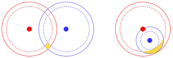 Moreover, the intersection geometry is important for space resection. Figure 4 shows the difference between good and bad intersection geometry, where the red and blue points are assumed to be two control points. The circle represents the distance between the intersection point and control point, and the thickness of the circle represents the range of the distance error. In other words, the difference between two circles with the same color represents the distance error. The intersection area of two control points shows the possible location of an intersection point. The larger the area, the more uncertain the intersection point. In Figure 4, the distance between two control points of the example on the left is larger than in the example on the right, representing better intersection angle and geometry. Therefore, the intersection area of the left example is smaller than for the one on the right. The uncertainty of the intersection point location is also smaller and almost the same in each direction. By contrast, the intersection area of the right figure is larger, indicating a larger intersection uncertainty. As a result, the dilution of precision (DOP) values of the left case are smaller than for the right case. According to this reason, the analysis of intersection geometry based on position accuracy and DOP is discussed in the results section.