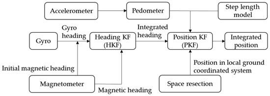 In addition to space resection, the other component of the proposed algorithm is PDR. The architecture of using space resection as the external aiding resource for PDR is shown in Figure 6. There are two Kalman Filters (KFs), one for heading and one for position estimations. The heading KF (HKF) and position KF (PKF) are used for distinction in this research.