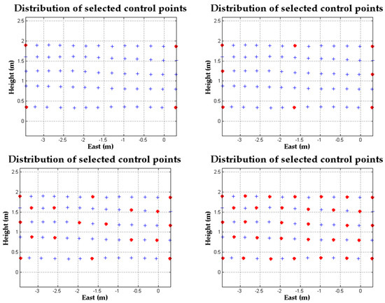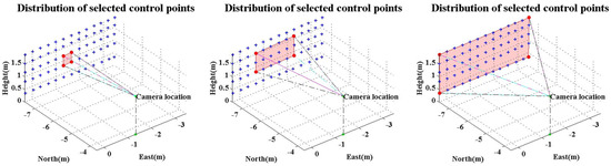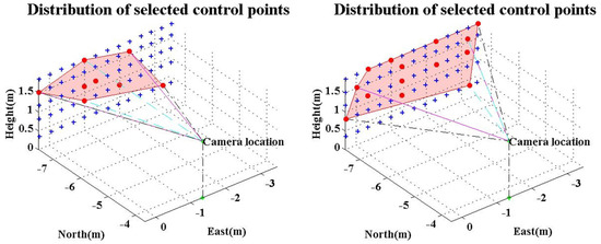According to the above analyses, accurate IOPs significantly improve the position accuracy of space resection. The assumption of Case 2 is a possible situation for a smartphone camera in the future, for which the principle distance recording in the image file will be more accurate, but the other IOPs such as lens distortion are still difficult to obtain. Therefore, we propose an adaptive weighted least square approach for space resection using a smartphone to reduce the error caused by lens distortion, then apply this in further positioning applications. According to Section 3.1.1, the remaining error of case 2 is mainly from lens distortion after applying the calibrated principle distance. The positon error of case 2 becomes larger when the used control points are far from the principle point. This means those control points have better intersection angles but with larger lens distortion. Finding the best balance between these two factors will provide the optimal estimation and reduce the error caused by lens distortion and lead to lower uncertainty. Figure 11 shows two scenarios for selected control points. The selected control points are based on the premise of even distribution and have various distances from the principle point. The following analysis evaluates the optimal weight of control points based on their distance from the principle point without the use of any calibrated IOPs. Furthermore, each smartphone takes three images at different times to evaluate the repeatability of the proposed method.