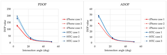 The DOP values of intersection angle analysis for two smartphones.