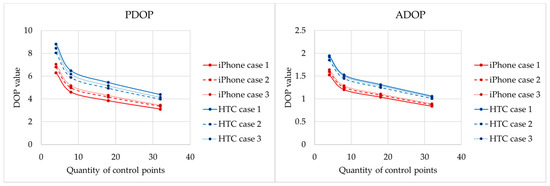 Figure 10 shows the values of PDOP and ADOP for the two smartphones. When more control points are used, better DOP values are obtained. However, the position accuracy shows no significant improvement when the DOPs become smaller because the intersection geometry is good enough with only four control points (the DOPs are already small enough, and more control points only slightly improve DOPs). This shows that the few control points used in this analysis are enough for good geometry of intersection, which successfully estimates the solution with lower uncertainty. Therefore, more control points are only meaningful when the added points can significantly improve the intersection angle and geometry for practical application. However, more control points also represent more redundant observation for least squares, which improves the reliability of estimation. Therefore, DOPs represent not only better geometry but also better reliability, which makes the iterative calculation successfully converge with lower uncertainty and the best possible estimation.