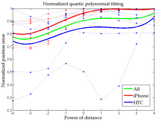 Table 6 and Table 7 show the position RMSEs for two scenarios using two smartphones. The three images were taken by each smartphone at different times. The first row shows the power of distance, which is the weight of each control point that depends on its distance from the principle point. If the power is positive, it means a larger weight of the image point with longer distance between itself and the principle point; if the power is negative, it means a smaller weight of the image point with a longer distance between itself and the principle point. Figure 12 shows quartic polynomial fitting of the optimal weight corresponding to different powers of distance and the normalized position error from tables, which illustrates the characteristic more clearly. The blue dotted lines show the results for the HTC, and the red dotted lines are the results for the iPhone. The solid lines represent the fitting results corresponding to the iPhone, HTC, and both using red, blue and green, respectively. The results indicate that the power of distance should be −3 or −4 for optimal estimation of space resection when the consumer-grade smartphone cameras are used with un-calibrated IOPs. This characteristic corresponds with the findings of previous analyses: the intersection angle has a lower effect for close range photogrammetry using a smartphone camera, but more distant control points cause greater lens distortion, which affects the position accuracy. Therefore, the adaptive weighted least squares method improves the position error by about five to ten centimeters by reducing the effect of lens distortion. However, two cases (Images 1 and 3 of HTC) do not match in this conclusion because the original position errors with equal weight are quite small. This means these two cases have already archived the limited accuracy of RMSE to about fifteen centimeters since the error caused by inaccurate principle distance and other observational error still remains.