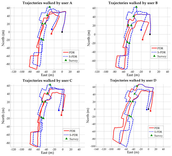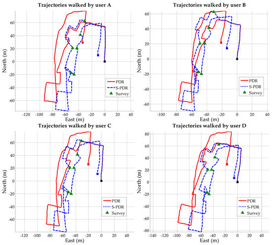 Figure 14 and Figure 15 show the estimated trajectories of four participants using iPhone 5S and HTC M8, respectively. The coordinate system is TWD97, which can be easily transformed to the World Geodetic System 1984 (WGS84). However, all the solutions of the trajectory are minus the coordinate of starting location coordinates for a clear illustration. The proposed space resection-aided PDR is named S-PDR in the following figures and tables. The dark green triangle (the same as the light green triangles and yellow points in Figure 13) represents the true location surveyed by the total station, which is used as the references for comparison. The red line represents the trajectory estimated by the PDR algorithm with the pedometer using threshold peak detection along with time intervals, an empirically formulated step length, and an integrated heading based upon gyro and magnetometer data. The blue dotted line represents the trajectory estimated by the proposed space resection-aided PDR. The red and blue squares are the end locations of PDR and space resection aided PDR, respectively. The black square is the starting point of both trajectories. The trajectories of the two algorithms overlap at the beginning, and then become different after the first space resection update. In order to evaluate the improvement of the proposed algorithm and verify whether it is actually more practical, all the used parameters of PDR are default values. Therefore, the position error caused by step length and step count is obvious because the corresponding parameters are not tuned.