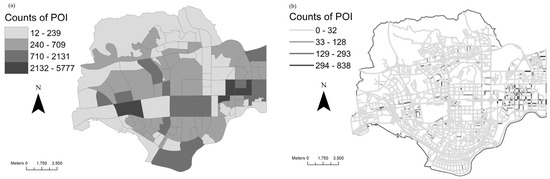 The base distribution in the study region: (a) the facility points of interest (POI) counts in 98 communities; (b) the POI counts for the 4372 basic spatial units (BSUs).