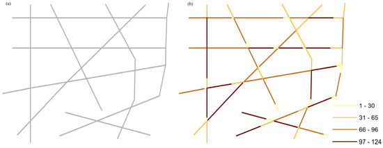 Based on the planar Moran’s I statistic, the network autocorrelation analysis modifies the spatial weight matrix to reflect the network connectivity between links. Like the local I statistic, the local G statistic can be applied to analyse network-constrained phenomena by modifying the weight matrix [13,15]. The local I statistic aims to determine the autocorrelation between a region and its neighbours; however, the local G statistic measures the concentration of attributes of a variable around a region [36]. In [37], the authors revised the local G statistics to allow the variable to be nonpositive and the weight matrix to be nonbinary. There are two versions of the local G statistic, namely and . The only difference between the two statistics is whether the unit is itself included or not. In [16], the authors recommended performing analyses with the local I and G* statistics simultaneously because the two statistics are complementary to each other.