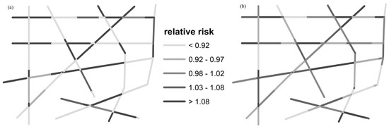 An observed spatial pattern of a phenomenon could merely result from spatial variation of the base distribution, and this possibility should be considered in network spatial analysis. For instance, the spatial variation of a disease largely depends on the distribution of the population at risk. Therefore, the procedure of standardization is usually applied to calculate a ratio, such as the relative risk [19], between the observed event counts and the expected event counts, which are determined using the base distribution. In addition, the links are usually divided into shorter segments called basic spatial units (BSUs) in the link-attribute approach [13,14,15], which enables the detection of spatial patterns at a much finer spatial resolution than that imposed by a given network [16]. However, analyses based on fine spatial units with small base values introduce an extra source of variability into the analysis because of random variation [20]. Typically, links with few (or zero) cases can generate extreme values of the ratios, as the variance of the standardized value is inversely related to the expected case count, and the small size of the base distribution will cause large variability in the estimated results.
