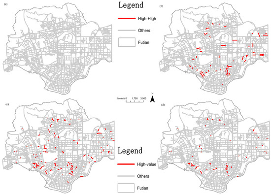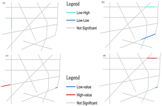 In Figure 6a, there is no significant high-high network autocorrelation in the study region; while a number of BSUs are identified as having significant high-high clustering patterns based on the posterior risk (Figure 6b). This implies that the proposed method based on hierarchical Bayesian models is helpful for detecting hotspots within network-constrained phenomena. Figure 6d presents the results of the local statistics using posterior risk without adjustment for the base distribution, where a smaller number of links are identified as having significant high value concentrations than in the results from GLINCS (Figure 6c). A comparison of Figure 6c,d reveals that the BSUs with significant high-value concentrations using posterior risk without adjustment for the base distribution always indicate significant clusters of high value using GLINCS. This implies that the selected POIs tend to form a clustered pattern with adjustment for the base distribution and that posterior risk can be used to identify clusters of urban facilities.