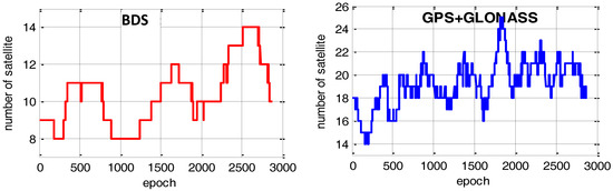 To test the performance of the new GNSS single-epoch AR method, GPS/GLONASS/BDS real data of two stations (Sta1 and Sta2) for 24 hours on 3 March 2014, were collected. The length of the baseline between the stations was 9.5 m. The observation interval was 30 seconds. Moreover, the position of the two stations is exactly known. In this section, we first fix the ambiguity of the BDS triple-frequency signals and then realize the AR of GPS/GLONASS signals using the method proposed in this paper. Figure 2 shows the number of visible satellites of BDS and GPS/GLONASS. From Figure 2, we can see that there are 8–14 BDS visible satellites in the experimental period. For the GPS and GLONASS combined system, over 14 satellites can be used in the data processing.