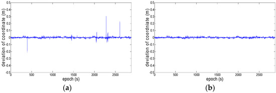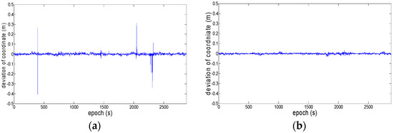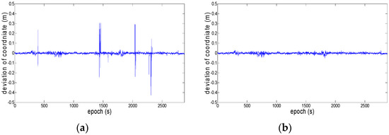 Deviation of coordinate (East). (a) without robust estimation; (b) with robust estimation.
