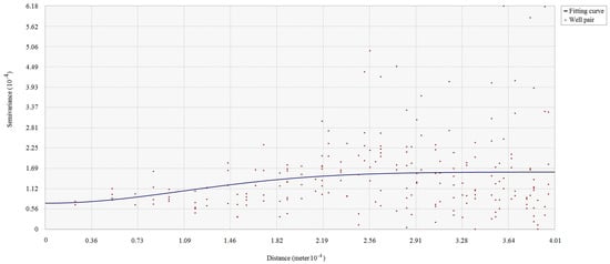 Figure 2 shows a semi-variogram cloud of the cumulative pore volume attribute in an area. Since the semi-variance increases as the spatial distance increases in the cloud, the semi-variogram cloud suggests that spatial dependence appears in the cumulative pore volume to some degree. Pairs of sample wells that are closer in distance on X-axis have more similar semi-variance values (Y-axis) for the cumulative pore volume than well pairs that are farther apart.