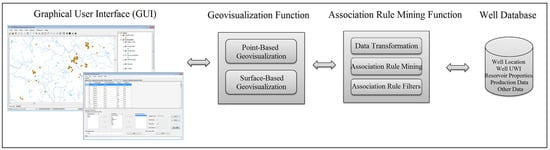 Based on the proposed geovisualization methods, we developed a system prototype, called ARM-GEOVIZ. The GUIs of association rule mining and geovisualization were developed using C# programming language with integration of the ESRI ArcObjects API. The prototype supports diverse data formats (*.mxd map file, *.lyr layer file, *.shp shape file, *.mdb geodatabase file) and displays them on the map. The prototype mainly included four components as shown in Figure 3: A well database, association rule mining function, geovisualization function, and graphical user interface (GUI).