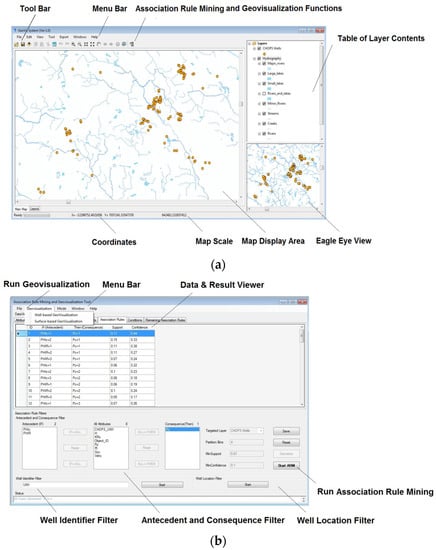The main GUI of the ARM-GEOVIZ prototype. (a) Main GUIs of ARM-GEOVIZ system prototype; (b) User interface of the association rule mining.