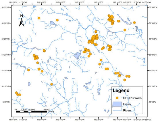 The Lloydminster heavy oil block is a large reservoir zone located in the central eastern part of the province of Alberta in Canada. In the block, more than 3000 wells have been drilled. One hundred and eighteen cold production oil wells were selected from the block based on the following selection criteria: (1) drilling date between 1992 and 2005; (2) vertical well; and, (3) one perforation formation. The distribution of the studied 118 CHOPS wells of the area is shown in Figure 5.