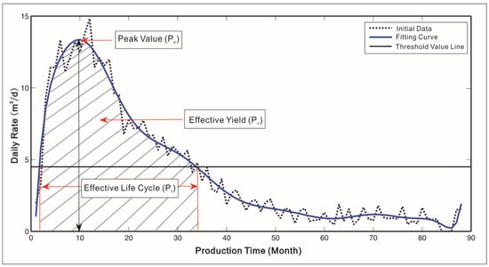 The reservoir property parameters used for association rule mining were six basic petro-physical parameters of a reservoir that can be used to identify to describe characteristics of a reservoir: cumulative porosity, cumulative pore volume, cumulative shale content, cumulative oil saturation, cumulative fluid mobility factor, and effective thickness [3]. To analyse the main features of production performance, a polynomial fitting curve of the daily production data that denoted production performance of the well was created. Three production parameters were used to characterize the fitting curve: peak value, effective life cycle and effective yield [3], as shown in Figure 6.