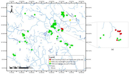 Figure 7 shows the corresponding visualization result of the above association rule (i.e., the fourth rule in Table 3). The locations of the three well classes are highlighted on the map using circle symbols with different colours: red, yellow and green respectively represent totally satisfying, partially satisfying and not satisfying the rule classifications.