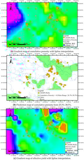 The gradient maps of the cumulative porosity and effective yield attributes were first generated by the Kriging method, as the spatial dependence of the two attributes was found to hold for the studied area in Section 4.3.2.1. The values of the attributes for the whole study area were also estimated with interpolation using the corresponding known attribute values at nearby wells.