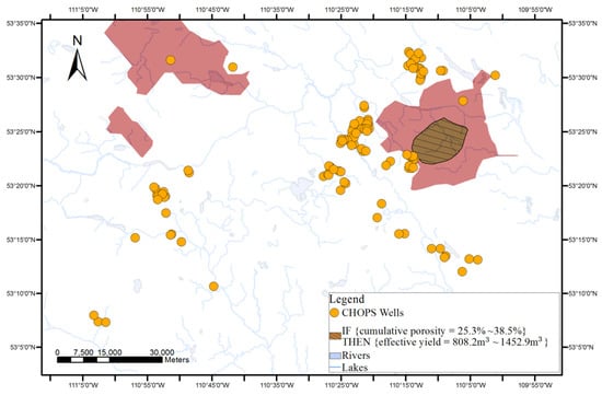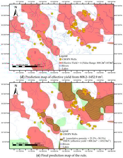 Finally, the prediction map of the rule can be gained by overlaying the applicable areas of cumulative porosity = 25.3%–38.5% and effective yield = 808.2–1452.9 m3, as shown in Figure 9e. The predicted areas where the rule may be applied or occur are located in the central northeast of the studied reservoir area within the black barrier denoted by oblique lines.
