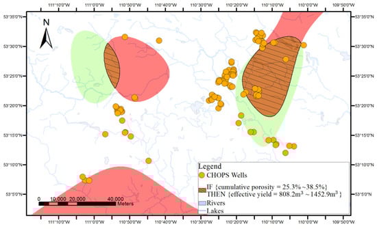 The applicable areas with cumulative porosity between 25.3% and 38.5% and effective yield between 808.2 m3 and 1452.9 m3 were extracted from the gradient cumulative porosity and effective yield maps and indicated using green and red colours. Through the overlaying of the applicable areas of the two attributes, the final prediction map of the association rule, i.e., IF {cumulative porosity = 25.3%–38.5%} THEN {effective yield = 808.2–1452.9 m3}, was obtained, as shown in Figure 12.