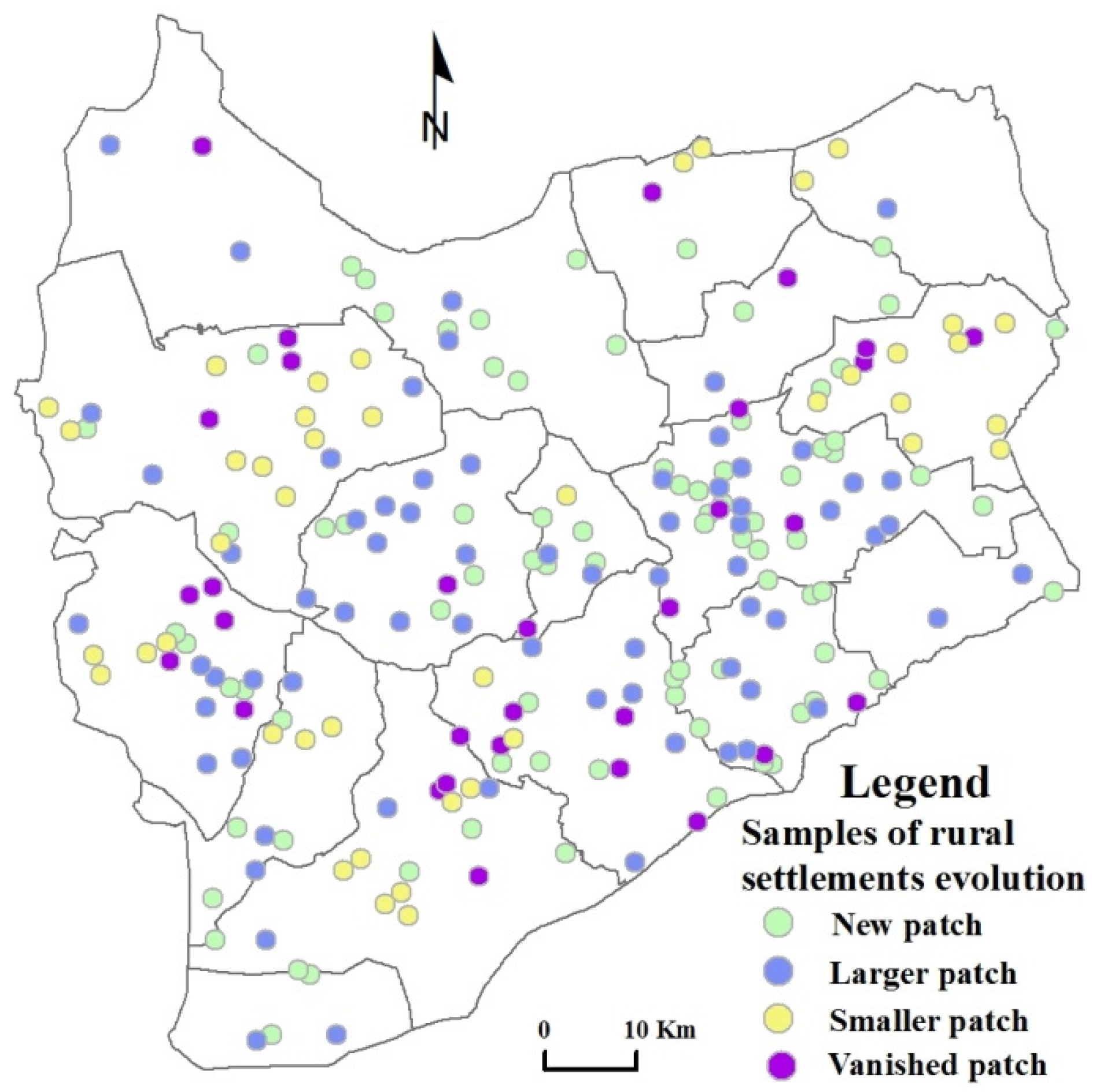 From the changes in the total area of rural settlements, rural settlements could be classified into increased rural settlements, invariant rural settlements, and decreased rural settlements. Rural settlement patches, like the naturally-formed village, means rural settlement plots whose borders are enclosed within building plots and other lands for farmers' lives. At the scale of the rural settlement patches, increased rural settlements could be divided into new and larger ones, and decreased rural settlements could be divided into smaller and vanished ones. The relevant description can be seen in Table 1.