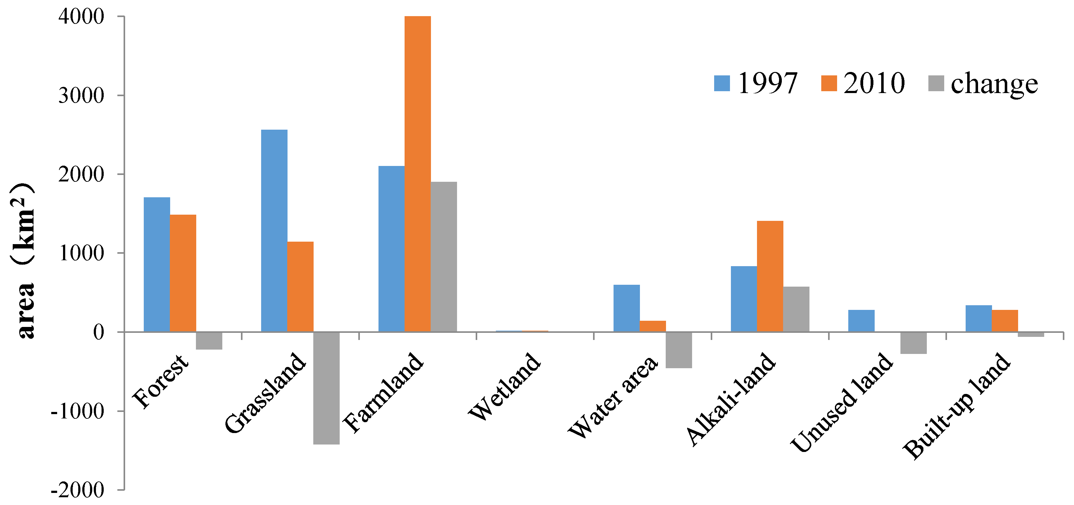 In 1997, the area of grassland was 2563 km2, accounting for about 30% of the total land area of Tongyu County. Hence, the grassland occupied the largest proportion in the land ecosystem, followed by farmland (25%) and forest (20%). The area of wetland was small. In 2010, the area of farmland was 4003 km2, accounting for about 47% of the total land area of Tongyu County. Hence, farmland occupied the largest proportion in the land ecosystem, followed by forest (18%) and alkali land (17%). The areas of wetland and unused land were small. In 1997, farmland and grassland were the major land-use types in Tongyu, demonstrating that Tongyu County was mainly a farming pastoral transitional zone. In 2010, the regional characteristic was weakened, and farmland became the predominant land-use type.