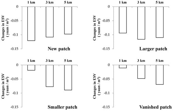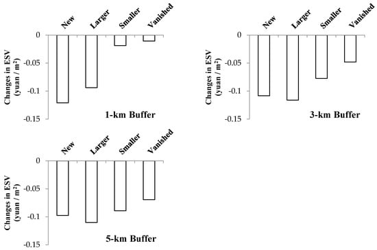 3.2.2. Changes in the Land Ecosystem Services Values within Different-Sized Buffers