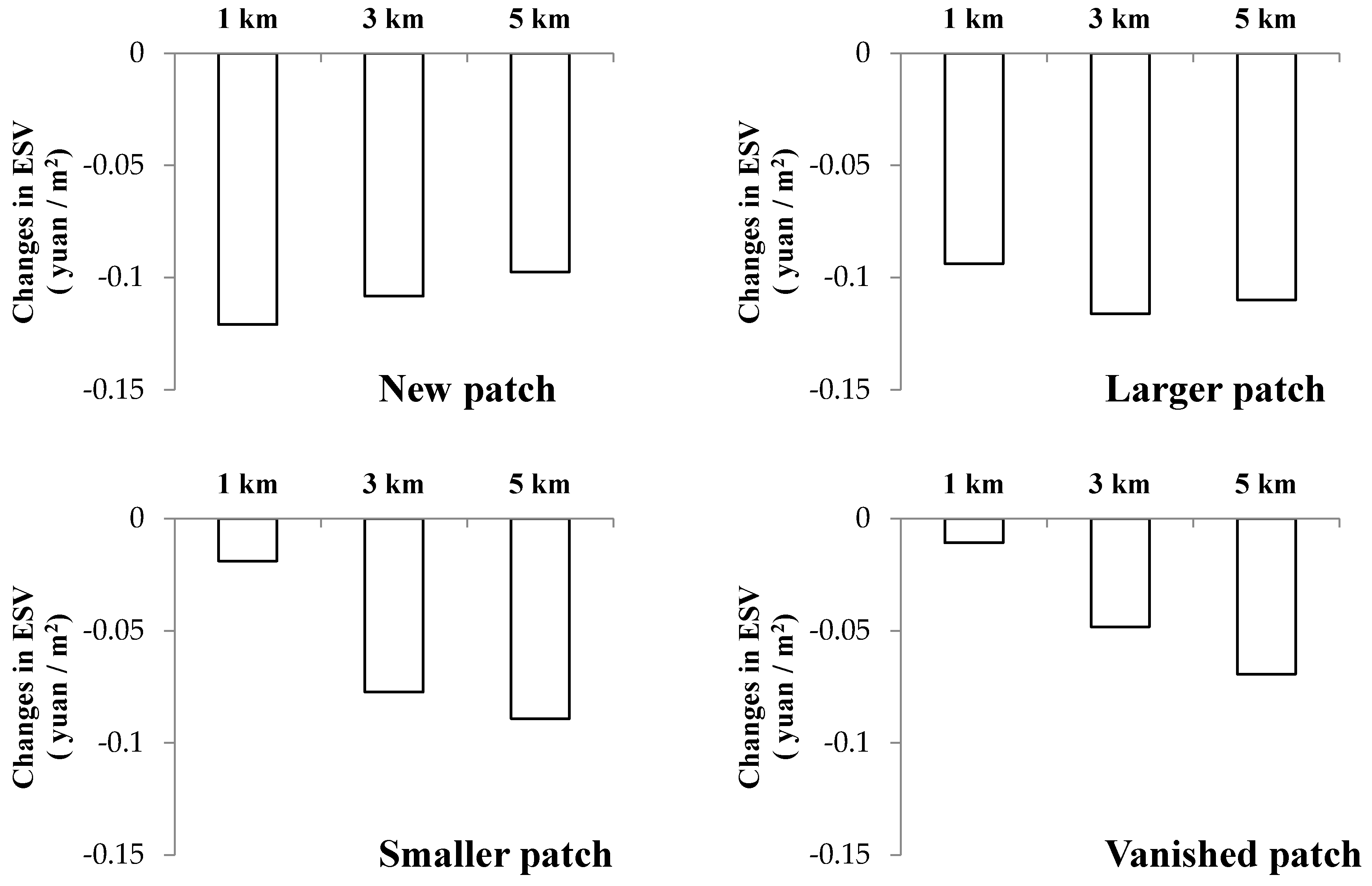 As shown in Figure 4, the effects of different changing rural settlement types on the variations of land ecosystem service values were different. The reductions of the ESVs on surrounding land of various rural settlement evolution types from large to small were basically as follows: The new patch > the larger patch > the smaller patch > the vanished patch, demonstrating that the increased rural settlements had larger effects on the variations of land ecosystem service values than the decreased rural settlements and the new rural settlements had the largest effect. These influencing characteristics in the 1-km buffer zones were the most obvious. As the buffer distance increased, the differences of reductions in ESVs between increased rural settlements and decreased rural settlements had narrowed, indicating this effect characteristic had gradually weakened. Within the 3-km and 5-km buffers, the value change surrounding smaller rural settlements was still larger than the vanished rural settlements. However, the value change within the buffers of new smaller rural settlements was slightly less than the larger rural settlements, which was inconsistent with the 1-km buffer zone.