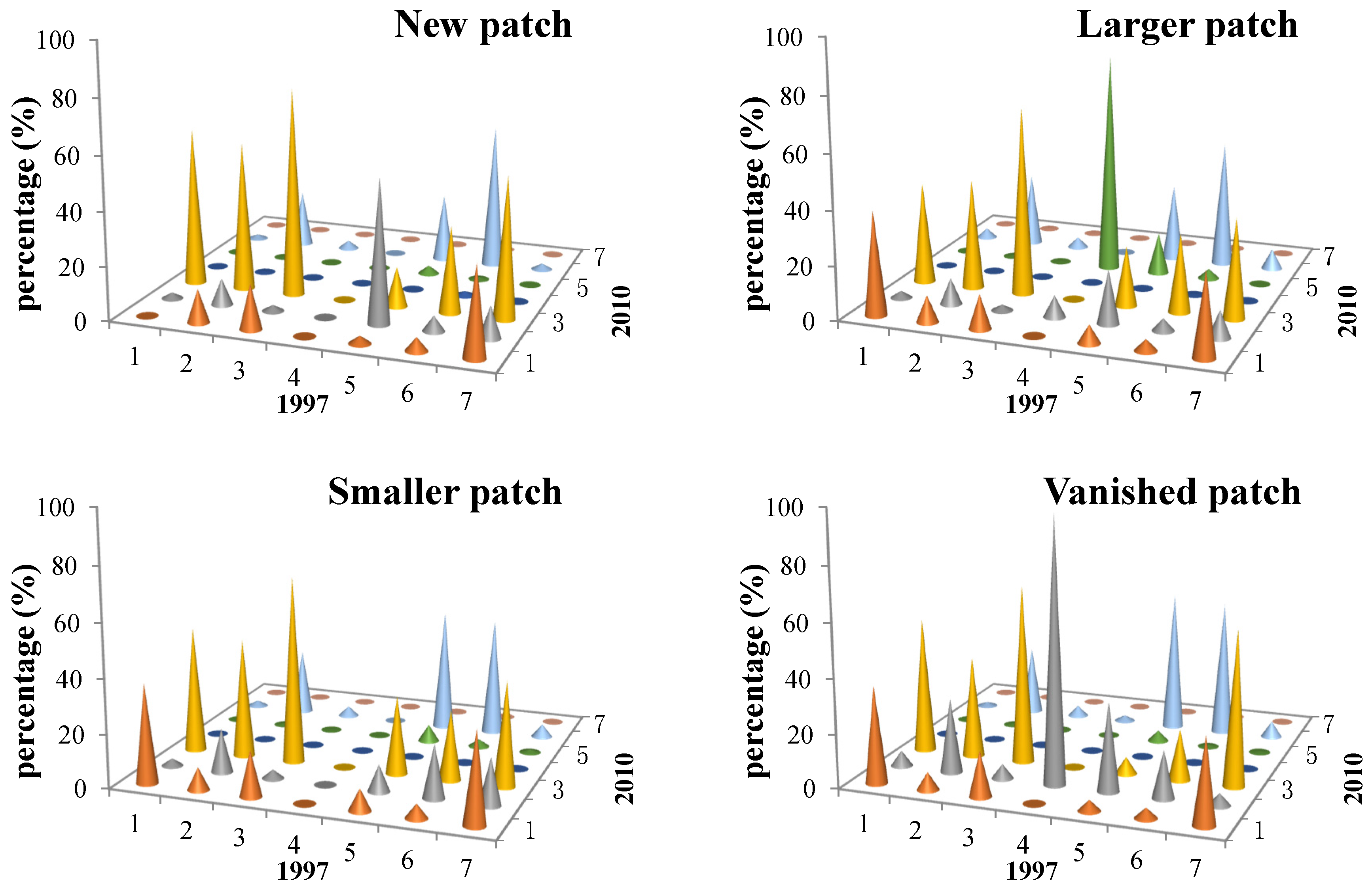 The area of each land-use type within the same-sized buffers around a rural settlement evolution type would be summed first, then the differences in the total area of each land-use type over the buffers between 1997 and 2010 can be obtained.