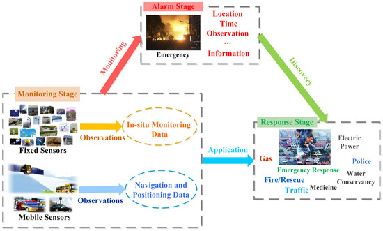 Additionally, as shown in Figure 1, smart city instant point observation data from various fields are involved in different stages of emergency responses, which should be quickly distributed to the relevant departments. For example, the monitoring stage is mainly to observe and record different types of point observation data isolated in various departments, namely the in-situ monitoring data and the navigation and positioning data; the alarm stage is to discover the location, time and other observation information for the emergency reported by sensors or witnesses; and the response stage is to make interdisciplinary point observation data work cooperatively through the spatio-temporal enhanced sharing for emergency response tasks. Different point observation data can record the spatio-temporal information of city emergencies, thus helping coordinate the sharing application of emergency response tasks in smart cities.