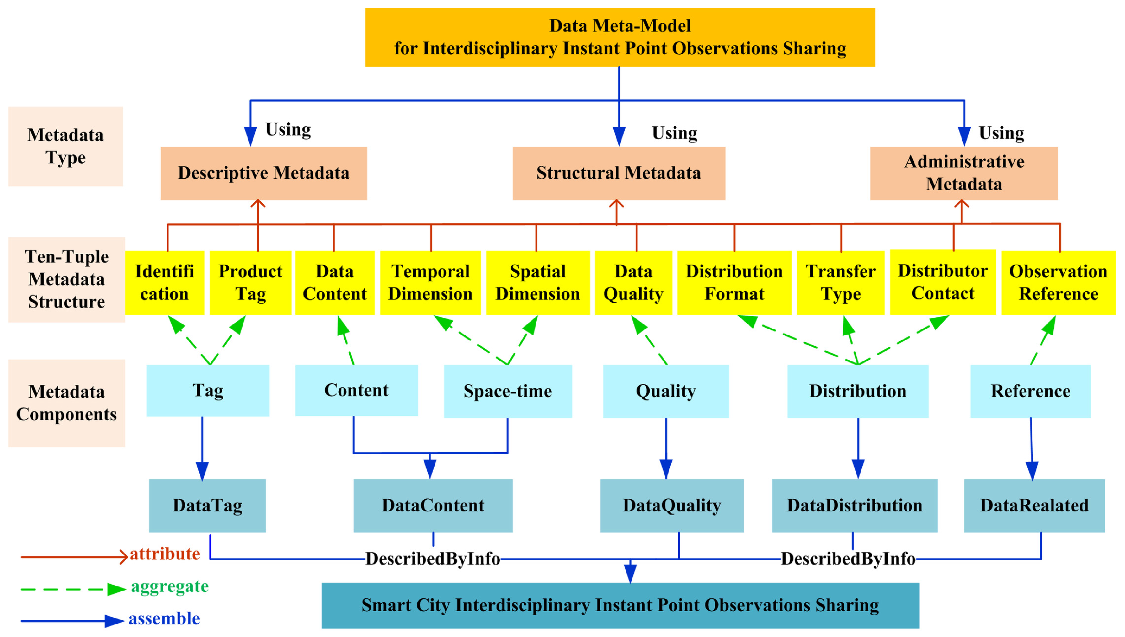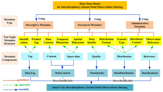 Referring to the related metadata standards, the organization structure of the six metadata components, as shown in Figure 3, can be further decomposed and refined into a ten-tuple metadata structure of point observations. As the core of the whole meta-model, the ten-tuple metadata structure includes identification, product tag, data content, temporal dimension, spatial dimension, data quality, distribution format, transfer type, distributor contact and observation reference. In addition, DMM for interdisciplinary instant point observations sharing is mainly expressed by using the descriptive metadata type, the structural metadata type, and the administrate metadata type. Descriptive metadata is the element that directly describes the inherent properties of point observation data, such as the identification, product tag, and data content. Structural metadata is used to describe the space-time structure of point observations for navigation, information retrieval and display, such as the temporal dimension and spatial dimension. Administrate metadata is the attribute element for the management of point observations resources, such as data Quality, distribution format, transfer type, distributor contact, and observation reference. Thus, the ten-tuple metadata structure can further form a general point observation data-sharing model, which contains the unified, comprehensive and spatio-temporal enhanced meta-model information.