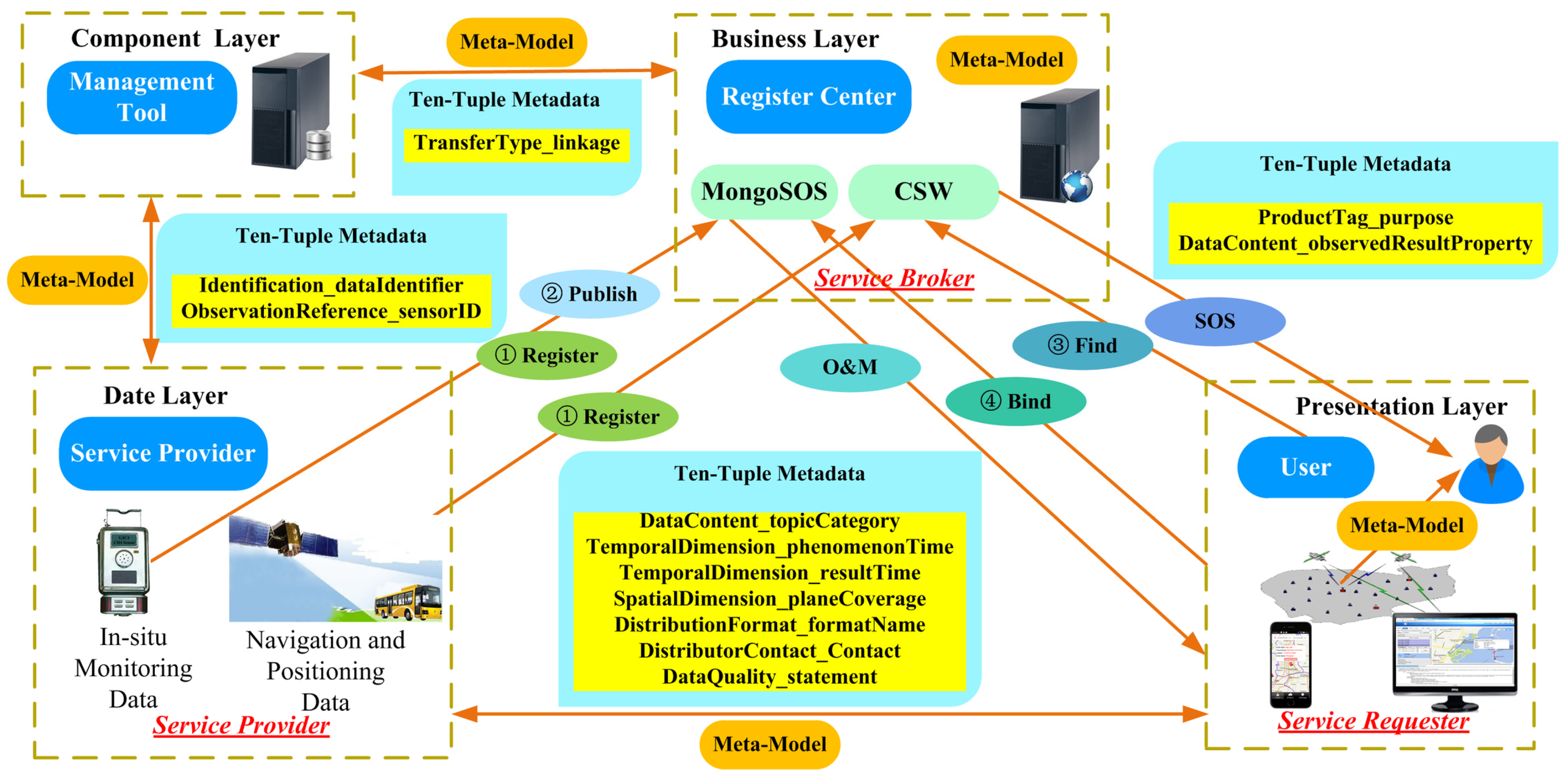 The Business Layer consists of a register center, which is mainly about registering the pre-established meta-model instances through the data web services, such as CSW and SOS. The service broker is able to take charge of service requests, as well as register and publish the point observation data provided by the service provider in the Data Layer. In addition, it can help users in the Presentation Layer to find the DMM and obtain corresponding results through SOS, for example, the observedResultProperty element of data content information.