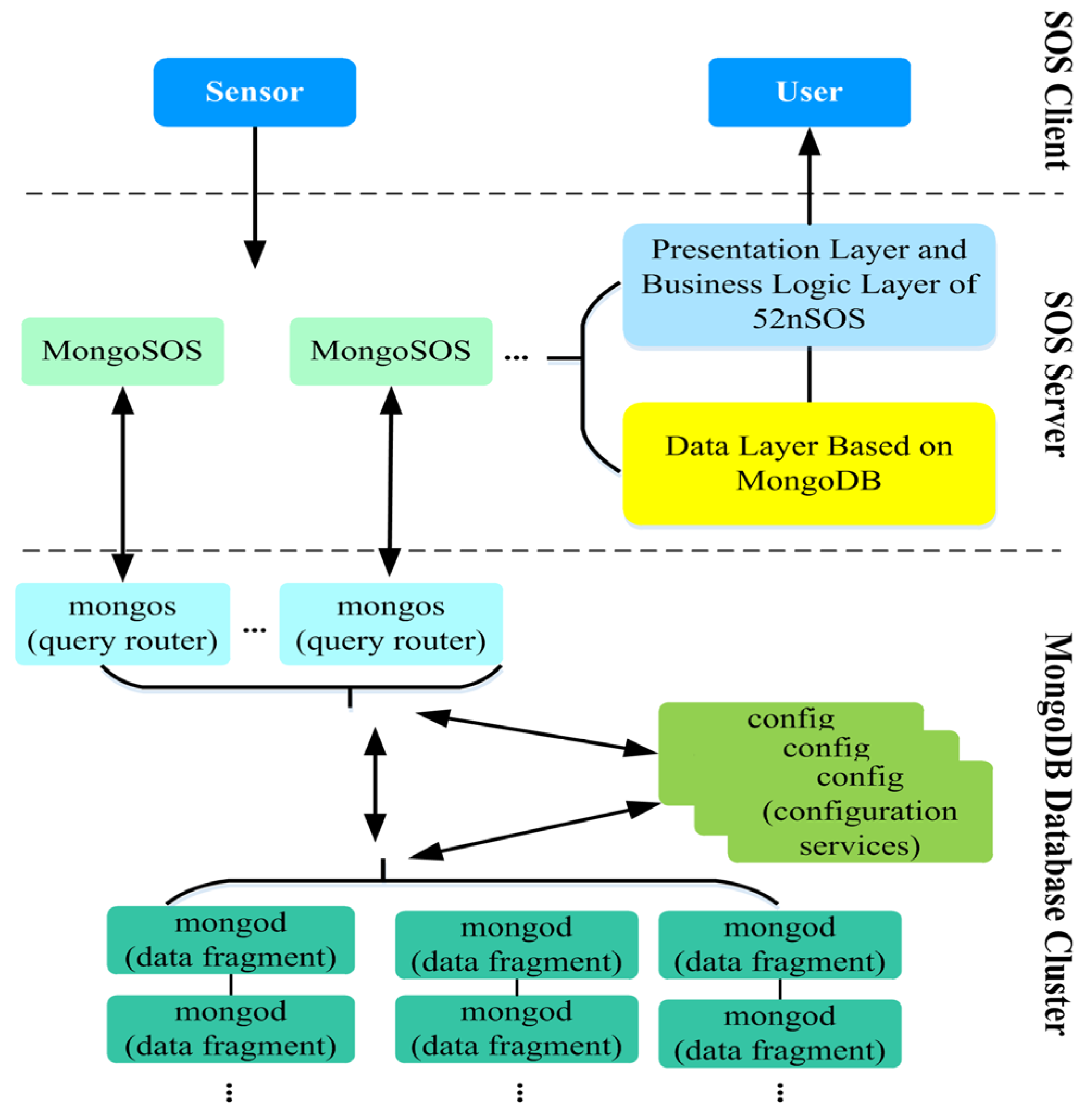 In order to solve the performance problems in instant sharing of mass point observation data, we have designed and implemented a NoSQL distributed storage SOS, which is named MongoSOS by focusing on the performance of SOS and based on MongoDB database. The architecture of MongoSOS is shown in Figure 6, which contains a MongoDB data cluster, multiple instances of MongoSOS (point to the same database), user, and sensor. MongoSOS is a web service that runs in Tomcat and can deploy multiple MongoSOS service instances on multiple machines, and each instance is connected to the same MongoDB database cluster with the same service functions. Sensor and user can insert observation data from any MongoSOS service instance to obtain the observed data. MongoDB cluster consists of three components, namely, mongod, mongos, and config, and a cluster can configure multiple components. Mongod is fragmented storage nodes, and responsible for the real deposit storage data. Mongos, that is, query routing, as the entire cluster of the entrance, is responsible for scheduling the operation of the database. Config, that is, configuration service started by the mongod program, is responsible for maintaining the metadata for the entire cluster, such as slicing the state of slices.