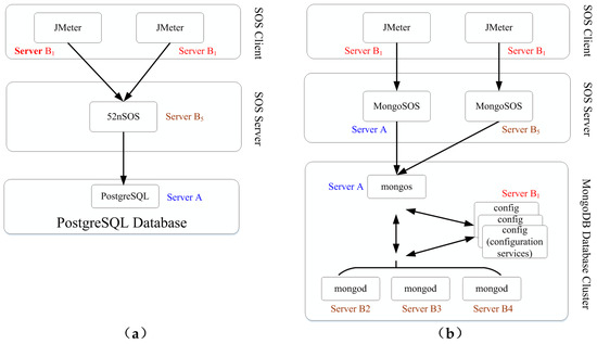 Test environment deployment architecture: (a) the 52nSOS deployment instance; and (b) the MongoSOS deployment instance.