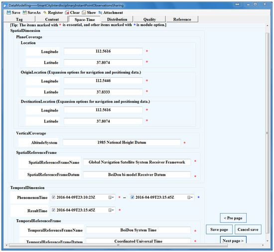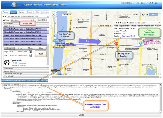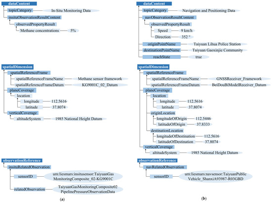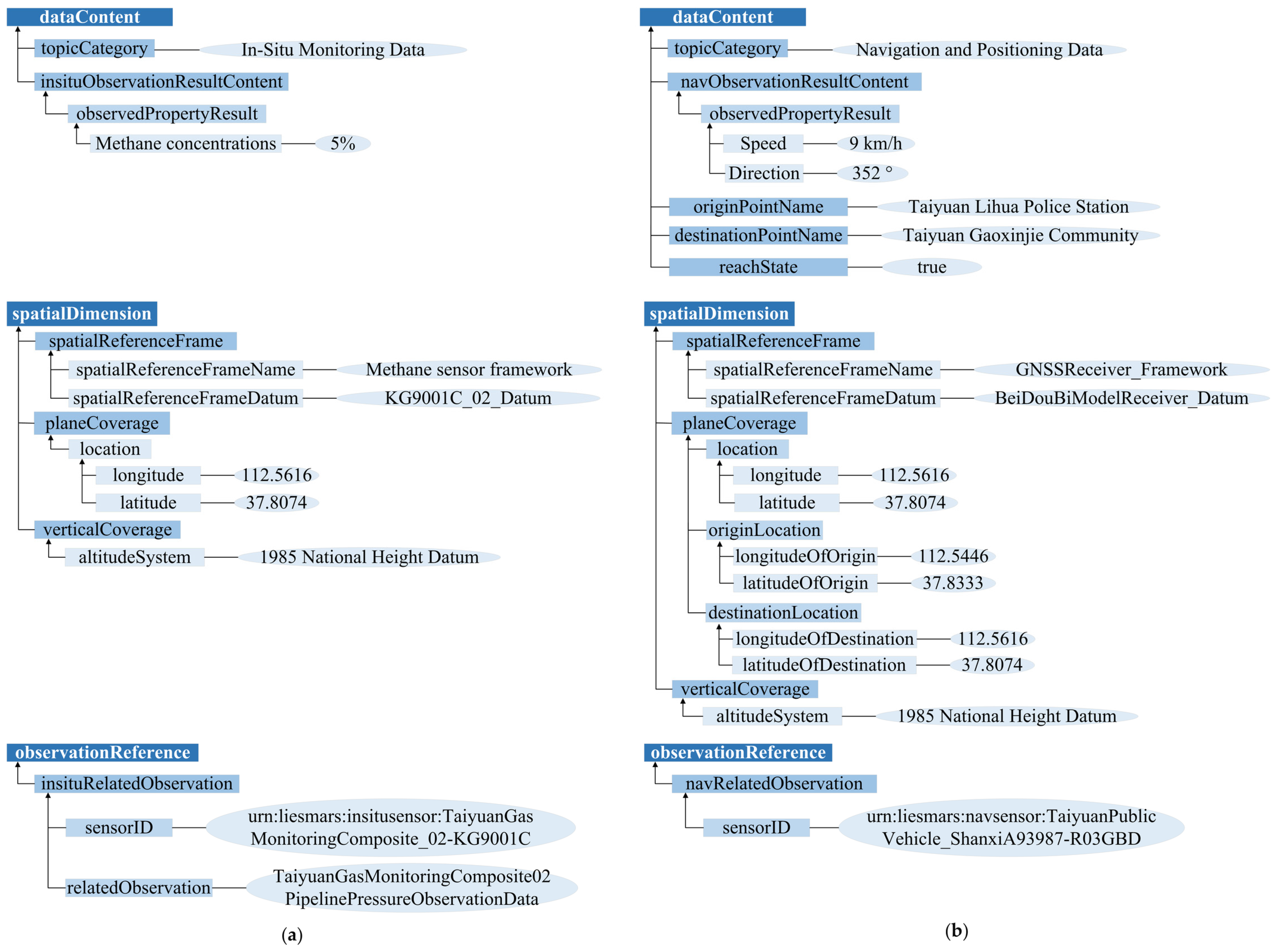 In addition, specific to the different data types and unique characteristics of the point observation data, the extension mechanism of the DMM is developed to extend needed element collections using the extensible MOF architecture. The extended element collections are the enhanced description based on the ten-tuple metadata structure of the DMM, such as data content, spatial dimension and observation reference are all important metadata collections defined in the ten-tuple structure and contain different attributes and values, which need to be extended according to the specific data type for various point observation data. The extended information description segments of the gas concentrations observation data instance and the smart city public vehicle monitoring data instance based on BDS are shown in Figure 12a,b, respectively, such as the observedPropertyResult element of data content, the planeCoverage element of spatial dimension and the relatedObservation element of observation reference. For the navigation and positioning data, as shown in Figure 12b, the originPointName element, destinationPointName element and reachState element of data content can also meet more extensive spatio-temporal sharing application requirements.