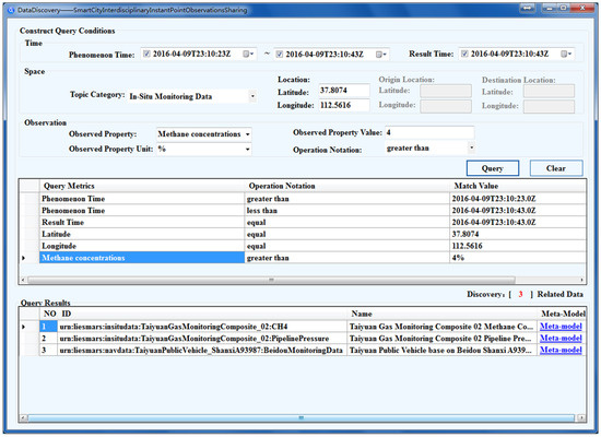 On the other hand, as for the problems of the sharing application, e.g., application interface and data security, which exist in the Linked Data and Data Vitalization, through the gas leak emergency response experiment including the gas concentrations monitoring and the smart city public vehicle monitoring in different fields, the comprehensive and consistent description of the spatial and temporal information for interdisciplinary instant point observation data have been realized. By the combined query of spatio-temporal information, the specific meta-models and corresponding data services, which meet the given conditions, are returned effectively. Moreover, the unified interdisciplinary integration management of point observations is implemented by the standard registration and release based on web services, such as CSW and SOS. Besides, to better realize the spatial-temporal enhanced sharing of diverse point observation data, the operations of access and insertion for navigation and positioning data can be achieved at the millisecond level through MongoSOS. For example, as shown in Table 4, the response time for the GetObservation operation (with spatial conditions) of the MongoSOS is 458 milliseconds, and the performance is improved by 2.3 percent compared with the same operation of the 52nSOS under the same conditions. In addition, under the occasion of the insertion of large amount of data, MongoSOS can reach 4,320 times per second for the rate of 300 million times InsertObservation operation, while 52nSOS can only get 146 times per second for the rate of 10 million times InsertObservation operation. The visualization of the spatio-temporal information for point observation data not only helps users more intuitively share the data resources in the spatio-temporal dimension but also contributes to further data scheduling and decision analysis.