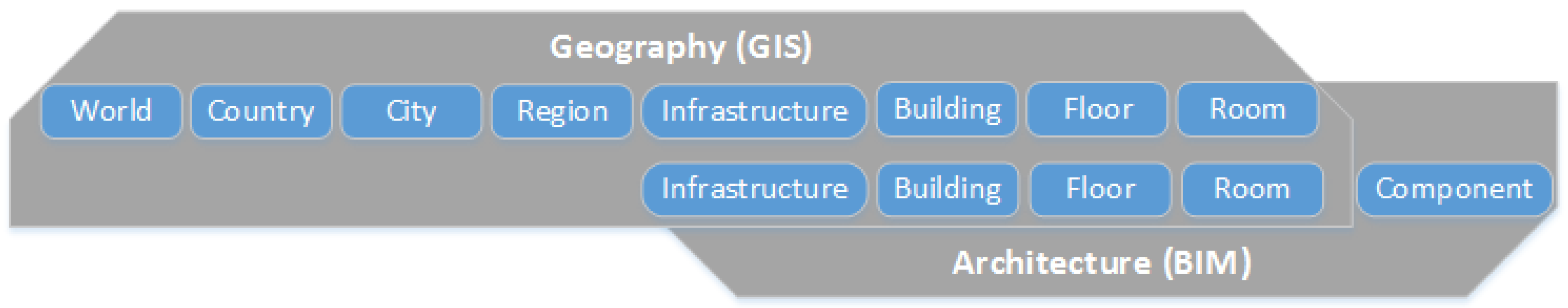 BIM and GIS interpret 3D modeling from two different perspectives: GIS focuses more on real world modeling, while BIM is more focused on the design process. Therefore, in CityGML, for example, a wall is represented as surface for each room separately, while, in IFC, a wall is a volume object, which is shared between rooms and the exterior shell [43]. The real world modeling of GIS is driven by the requirements of mapping tasks, while the design modeling of BIM is based on the representation of geometric design and construction details [44]. GIS often focuses on the geographical information and shape of buildings and building components from a geographical perspective. In contrast, BIM often focuses on the detailed building components and project information, such as cost and schedule from an architecture and construction perspective [45].