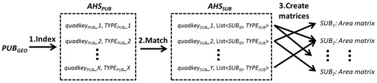 There are three steps for intersecting the geometry of publication (i.e., PUBGEO) with AHSSUB: (1) index; (2) match; and (3) create matrices. This workflow is shown in Figure 2. In order to efficiently intersect the PUBGEO with the AHSSUB, the AHS model first indexes the interior and boundary of PUBGEO with the same hierarchical structure (i.e., quadtree tile system). The outcome of this indexing is named as AHSPUB for clarity purposes.