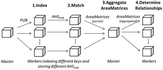 Figure 3 shows the high-level architecture and workflow of the distributed AHS model. There are four stages in the distributed AHS model, namely (1) index; (2) match; (3) aggregate area matrices; and (4) determine relationships. As the processes in the (1) index; (2) match; and (4) determine relationships stages are the same as for the standalone AHS model, the (3) aggregate area matrices stage mainly groups and integrates area matrices based on SUBID.