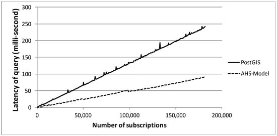 In order to demonstrate this contribution, we evaluate the scalability of the AHS model in this section. The query performance is measured whilst registering different numbers of subscriptions into the AHS model. The point-in-polygon query is chosen as our testing case, as it is one of the most common queries. A subscription with the coverage of a city (i.e., a polygon) was simulated and assigned WITHIN as the topological operator in the spatial predicate. This was followed by the simulation of a publication with a point geometry located in the city. With the simulated subscription and publication, different numbers of subscriptions were registered into the AHS model (with different subscription identifier SUBID) and the query latency measured every 500 additional subscriptions by sending the publication to the AHS model. The same test was performed on an off-the-shelf PostGIS database for comparison.
