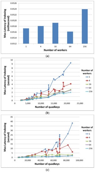 Furthermore, as the distributed AHS model can execute indexing tasks in parallel, we also measure the indexing latency when using different numbers of workers. However, in order to avoid machine heterogeneity, we used a single machine to simulate each worker in the distributed AHS model by executing workers’ tasks independently. We simulated scenarios of distributed AHS models with one, four, 16, 64, and 256 workers. While the one-worker scenario is basically the standalone AHS model, each worker in the four-, 16-, 64-, and 256-workers scenarios handles a quadkey in the first, second, third, and fourth levels of the quadtree, respectively. For example, for the four-workers scenario, we simulated four workers handling quadkeys ‘0’, ‘1’, ‘2’, and ‘3’. With distributed computing processes, the entire process is considered as finished at the time that the last worker finishes its task. Here we present the maximum (instead of average) indexing latency from workers in each scenario.
